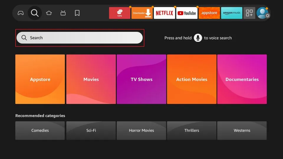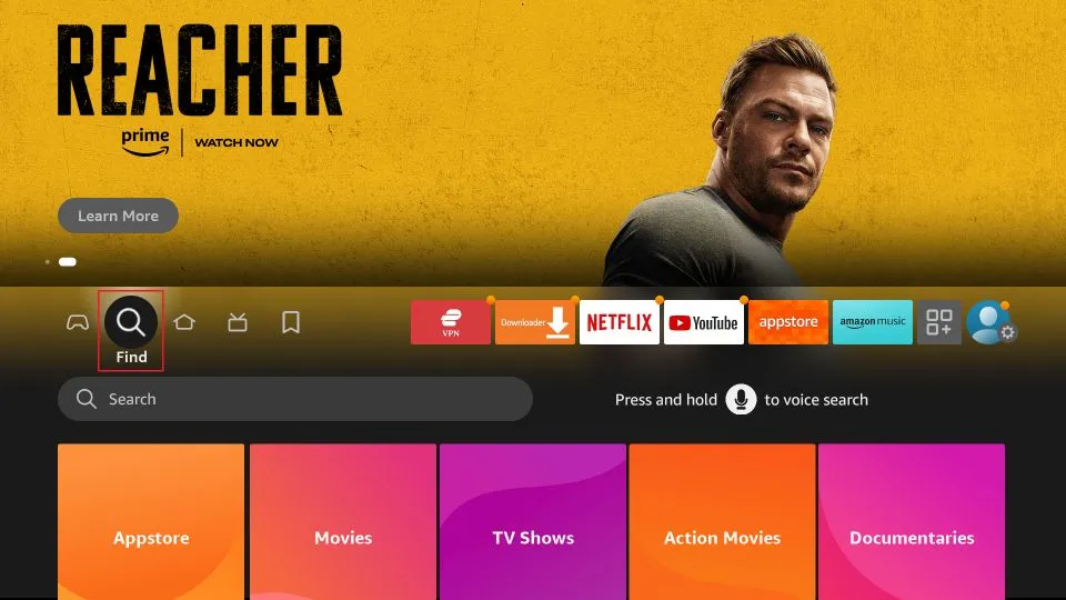 2. Power on your Fire TV Stick: Navigate to the ‘Find’ option, followed by the ‘Search’ option.
