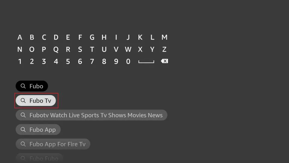 3. Enter “Fubo” into the search field. Once you start typing, “Fubo TV” will appear in the search suggestions. Highlight and select “Fubo TV.”