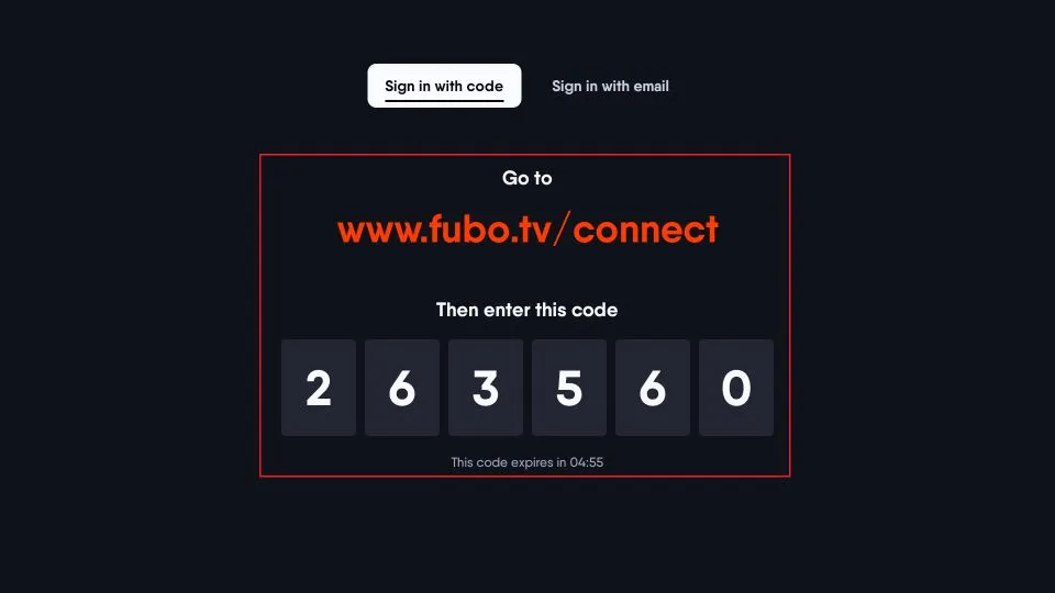 A code will appear on your TV screen. Visit fubo.tv/connect on your phone or computer, log in if necessary, and enter the code.