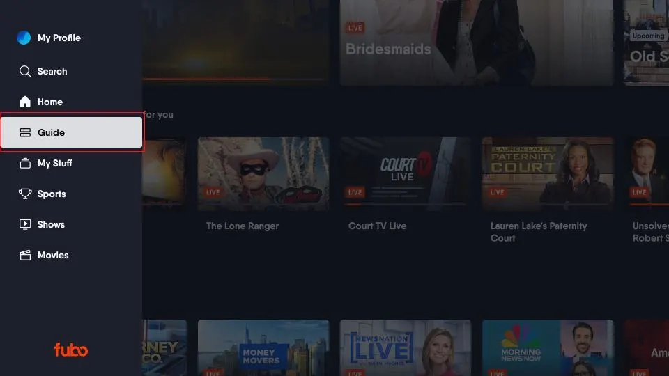 Open the side menu to explore the Guide section, where you can see a detailed list of live channels available on Fubo, including Fox, NBC, etc.